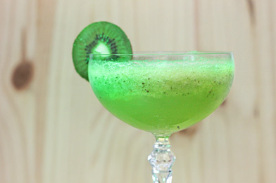 Mixer le rhum blanc, le jus de citron, le triple sec, le sirop de sucre, la liqueur de melon vert, le kiwi et verser dans une coupe à champagne.